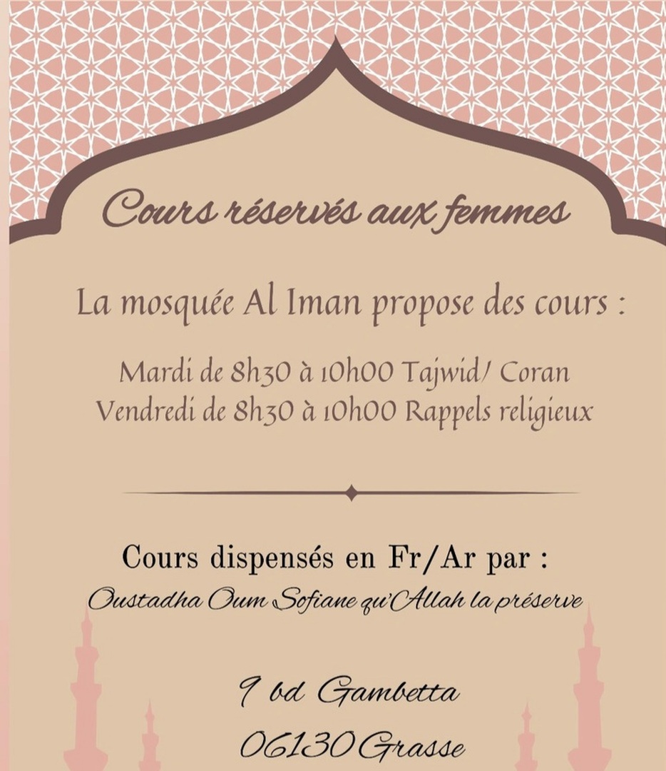 Votre Mosquée dispense des cours de religion le Mardi et Vendredi de 8h30 à 10H30 réservé aux femmes uniquement.